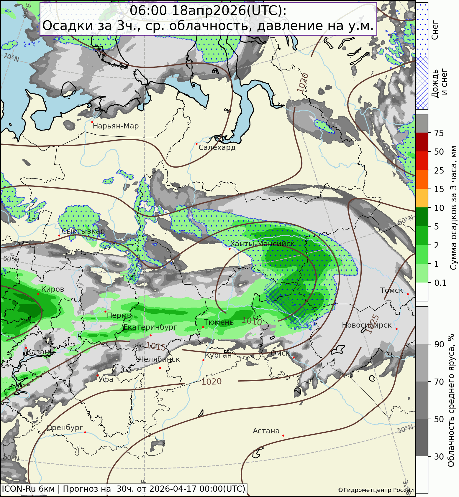 Северо-западный циклон пройдет по северной окраине Свердловской области ближайшей ночью, вызывая во многих районах дожди. Холодный атмосферный фронт циклона 18 апреля поделит территорию области на холодную северную часть, где осадки начнут переходить в снег, и более теплую южную, где 18 апреля будет еще относительно тепло. 19 апреля погода ухудшится в связи с подходом нового циклона с запада. Осадки в северных и центральных районах усилятся, кое-где могут быть сильными и очень сильными (снег, мокрый снег), будут сопровождаться отложением мокрого снега, гололедом. Предполагается, что крайний юг области 19 апреля останется на теплой стороне фронта, осадки здесь большее вероятны в виде дождя.