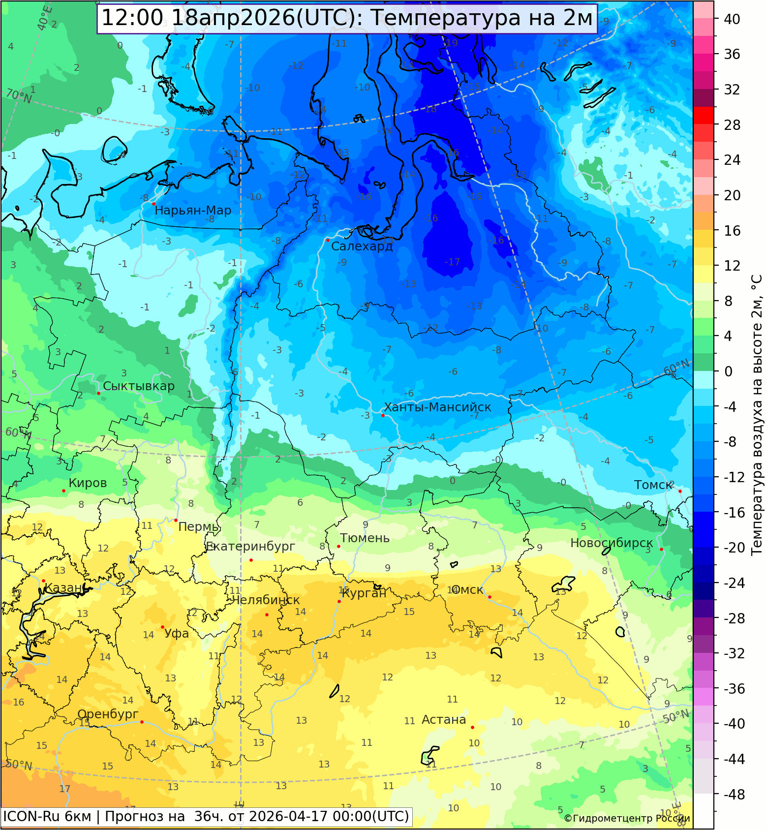 Удерживалась малооблачная погода при температуре воздуха днем от 6° в Атымье (крайний север) до 13° в Красноуфимске и Михайловске, ночью 17 апреля -1,-8°. Екатеринбург: днем 11°, ночью -0,4°.