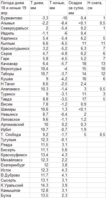Сильные осадки в виде снега (за сутки до 11-18 мм) прошли широкой полосой от линии Нижний Тагил-Тавда до Серова, образовался снежный покров высотой 5-13 см, отмечался гололед. Южнее этой зоны наблюдались небольшие осадки в виде дождя и мокрого снега. На крайнем севере (Ивдель и севернее) выпал небольшой снег, похолодало к утру до -5,-10°. На крайнем юге преобладала погода без осадков, отмечался сильный ветер 15-16 м/с. Екатеринбург: днем 12°, ночью +3,8° (отмечены следы дождя).