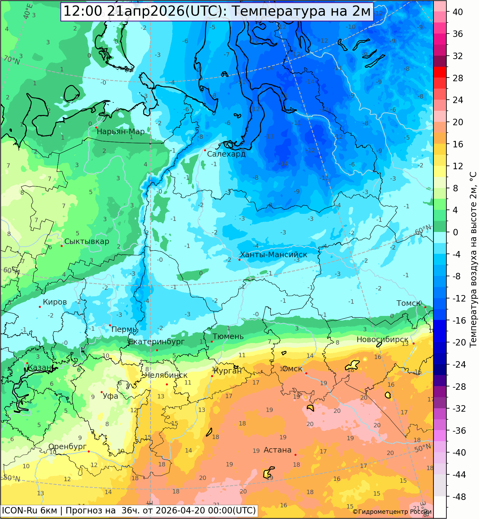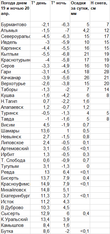 На севере области продолжались сильные снегопады, отмечался гололед, на дорогах снежный накат. Начиная с 18 апреля, во многих северных районах области в сумме выпало 70-120% месячной нормы осадков (преимущественно в виде снега). Высота снежного покрова 10-28 см. Температура в северных районах днем была 0,-6°, ночью 20 апреля -2,-7°. На юге осадков было немного, температура днем до 8-15°, ночью +1,+8°. Екатеринбург: днем 11,3°, ночью +3,7°.