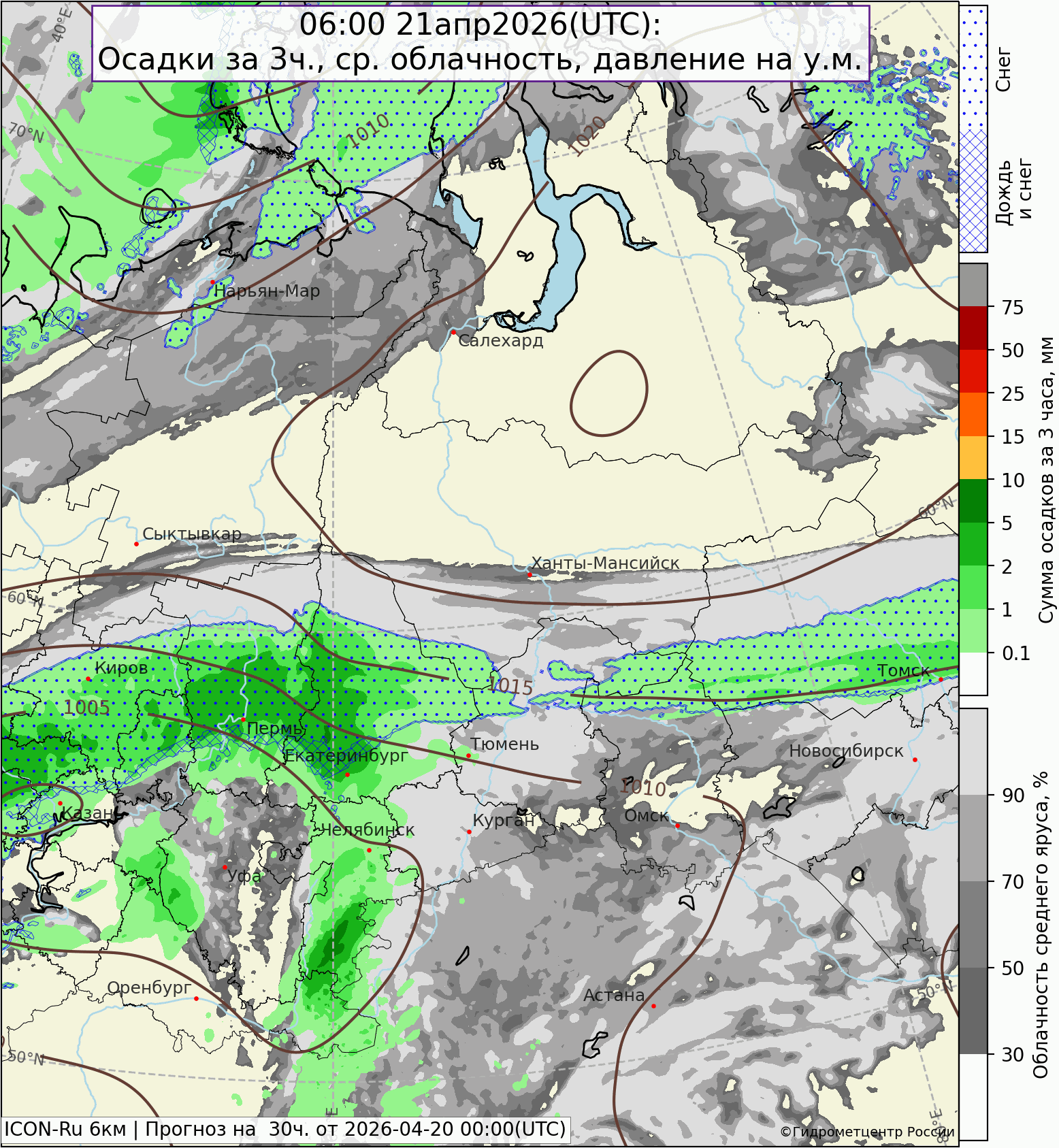 Циклон, развившийся в районе Поволжья, 21 апреля поднимется на Урал, пересечёт Свердловскую область с юго-запада на северо-восток. Снегопады сохранятся в северных районах, на юге области, включая Екатеринбург, ожидается дождь с мокрым снегом ночью с гололедом, гололедицей на дорогах.