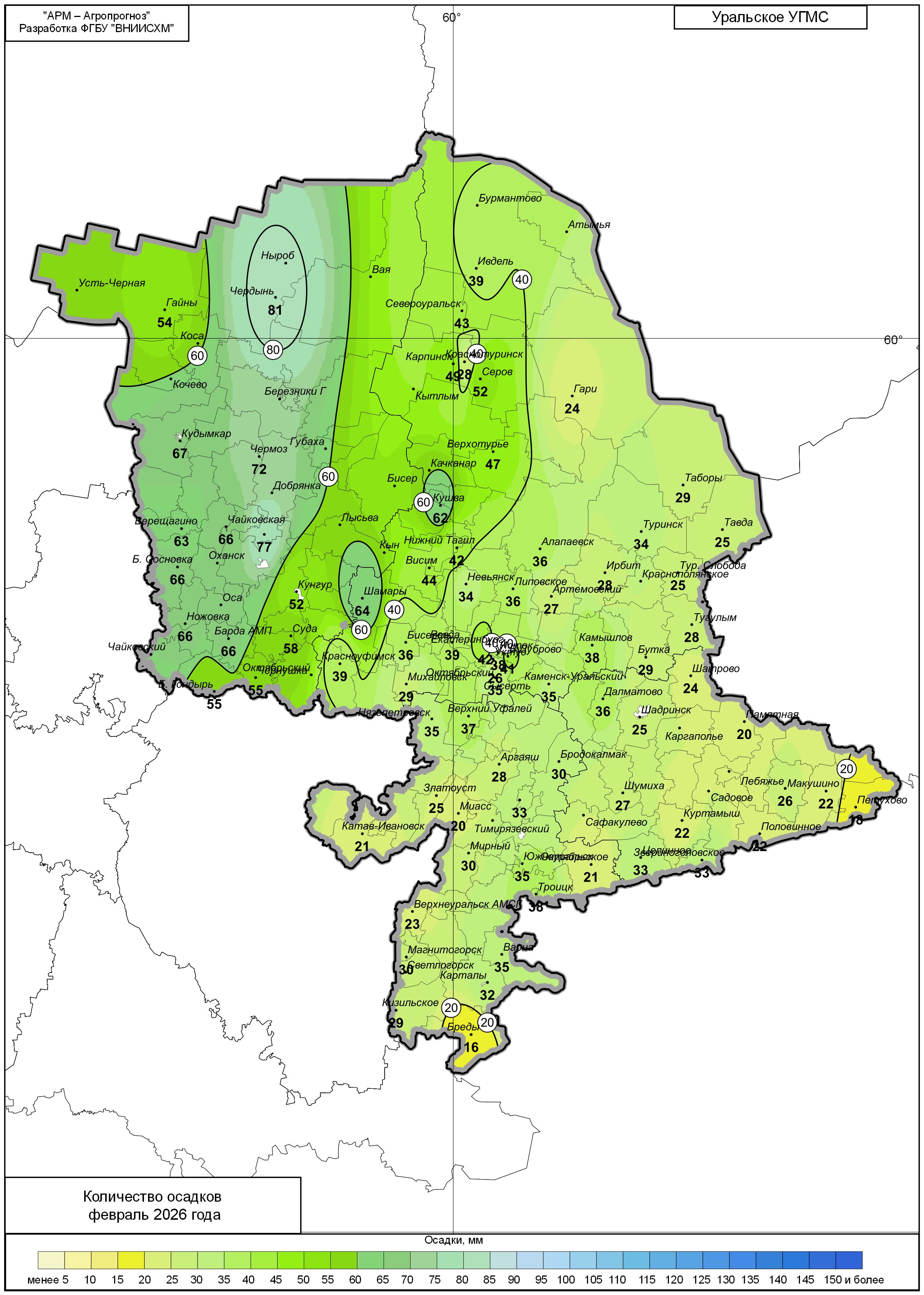 Снег выпадал часто в течение месяца, сильный снег 6-12 мм за сутки отмечен 4, 16, 17, 21 февраля, меньше осадков было в последние дни месяц 25-28 февраля. Общее количество составило на Южном Урале 18-37 мм, 130-220% нормы, в Бредах 64%. в Свердловской области 24-44, в горах 62 мм, в Пермском крае 50-87 мм, что составило 130-275%, в Серове 319% нормы. В ранге многоснежных месяцев в Пермском крае февраль занял 1-2 места, в Перми впервые в феврале выпало 80 мм осадков.